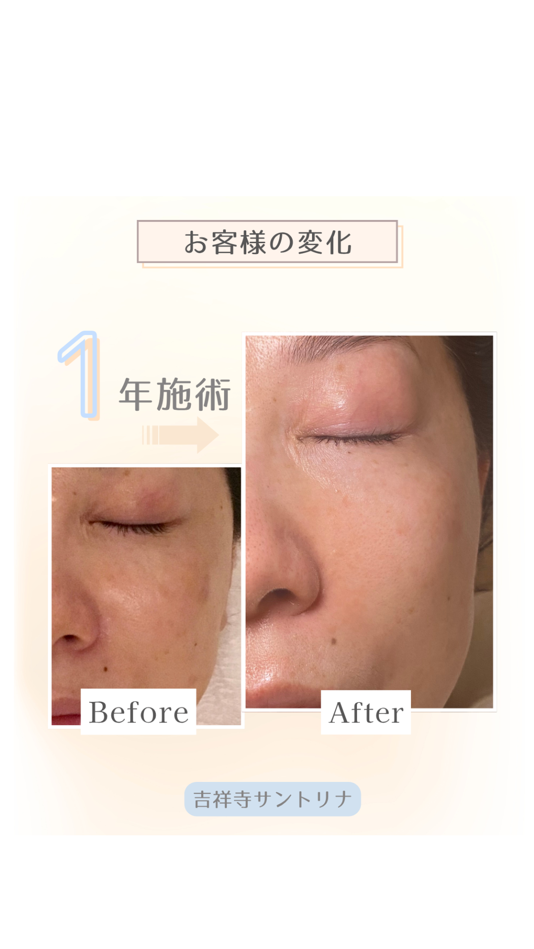 シミのお悩みで通ってくださっているお客様の、1年後の変化です。 コツコツと継続してケアを重ねていくことで、 気になっていた部分が少しずつ目立ちにくくなり、 お肌...